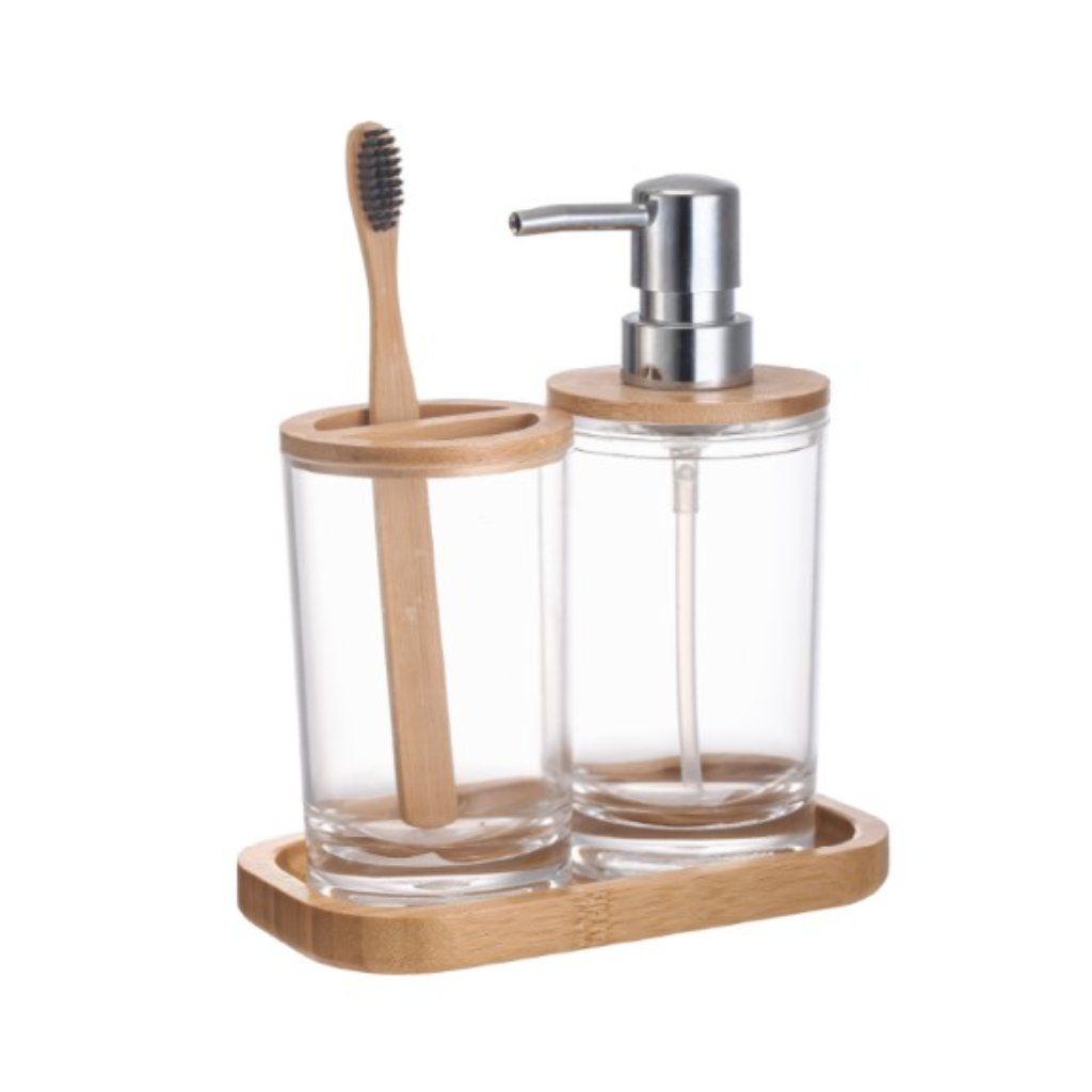 סט אמבט 3 חלקים אקרילי שקוף עם במבו