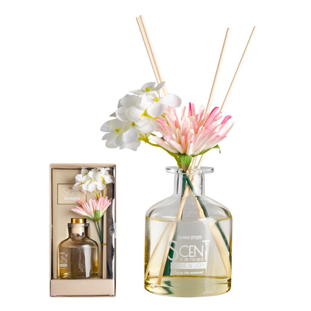 בקבוק ייחודי, פרחים ומקלות באריזת מתנה מהודרת ומיוחדת