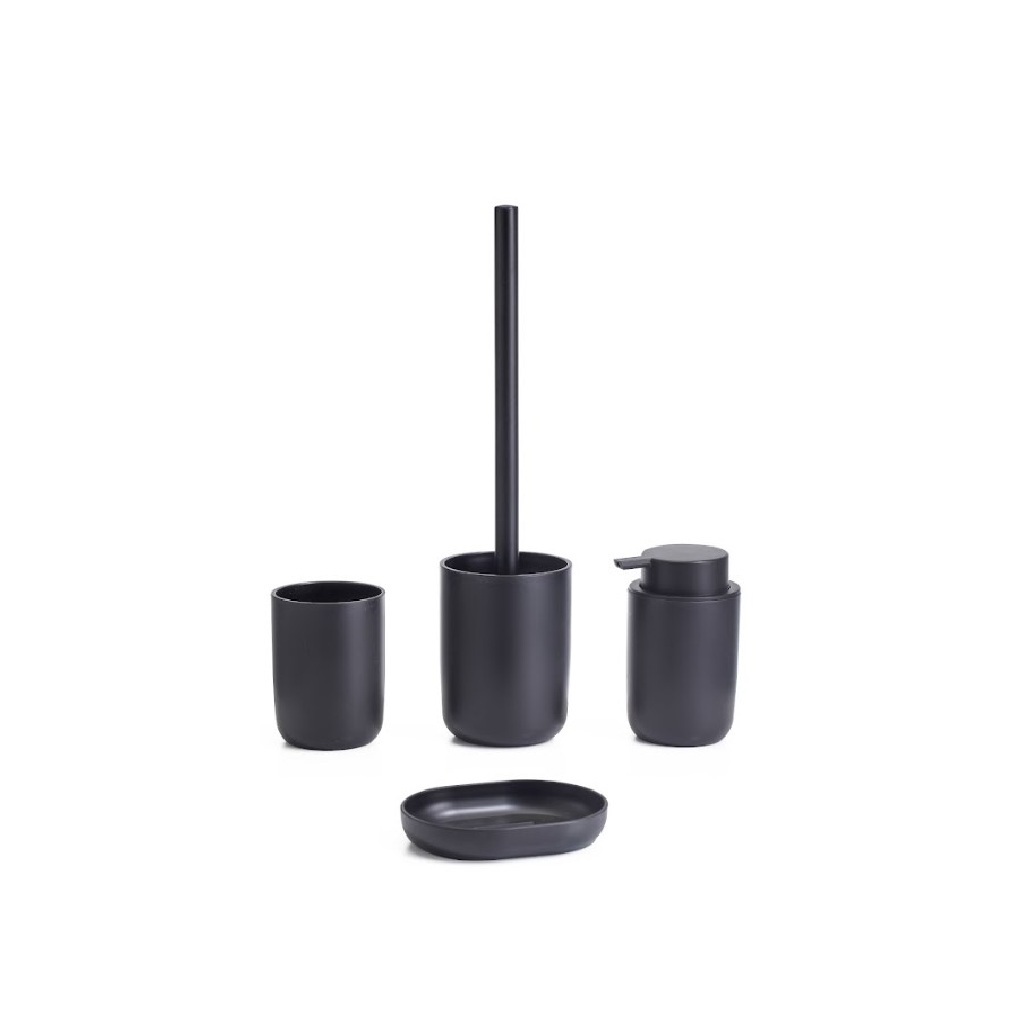סט אמבטיה 4 חלקים עשוי מפלסטיק איכותי ועמיד בצבע שחור, מתאים למגוון סגנונות עיצוב חדרי רחצה ושירותים